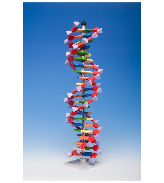 Model DNA 22 častí. Systém miniDNA® obsahuje farebne odlíšené, abstraktne tvarované časti navrhnuté tak, aby reprezentovali dusíkaté bázy, päťuholníkový cukor a pyramidálne fosfátové zložky potrebné na vytvorenie modelu dvojzávitnicovej DNA. Tri vodíkové väzby, ktoré spájajú cytozín s guanínom a dve, ktoré spájajú tymín s adenínom, sú reprezentované príslušným počtom kolíkov. Obsah balenia: 11 x tymín (oranžový) 11 x adenín (modrý) 11 x guanín (zelený) 11 x cytozín (žltý) 44 x deoxyribóza (červená) 44 x fosfát (fialový) Rozmery: cca 44 x 11 x 11 cm Hmotnosť: cca 500 g.