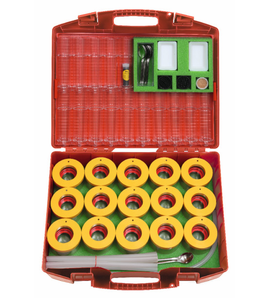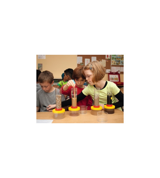 Pomocou súpravy na čistenie vody a prívod vody žiaci získajú náhľad a vedomosti o tom, ako sa vyrába pitná voda, zabezpečuje jej čistota a ako sa distribuuje. S materiálom sady čistenie vody sa žiaci naučia: určiť, ktoré typy pôdy prepúšťajú vodu a ktoré ju zadržiavajú, zistiť, že štrk pieskových filtrov zachytáva pevné častice prítomné vo vode, ale nie také látky ako sú soľ, ropa alebo saponát, pozorovať účinky znečistenej vody na rast rastlín, spoznať štádiá mechanického čistenia znečistenej vody, rozpoznať princíp spojených nádob a ich uplatnenie v praxi. Rozmery: 54 x 45 x 15cm. Obsahuje materiál pre 15 pracovných skupín.