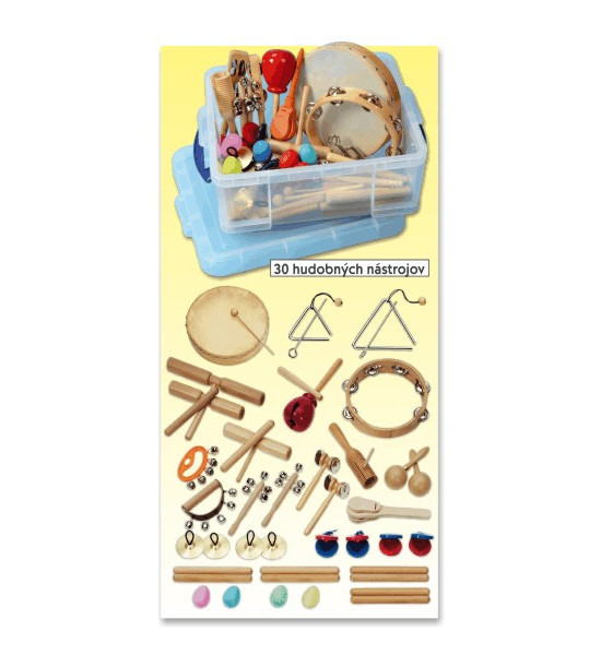 V hudobnej súprave Rytmus nájdete 30 drevených, kovových alebo plastovych hudobných nástrojov pre každé dieťa v triede. Ideálna na hudobnú výchovu. Balené v plastovej krabici 48 x 38 x 20cm. Obsah: - 1x bubienok (20cm) - 2x triangel (10 - 15cm) - 1x tamburína (20cm) - 1x tónovacie drievko Tulip - 1x štvorité tónovacie drievko - 1x dvojité tónovacie drievko - 1x drevené Guiro s paličkou - 1x rumba gule - 3x ručná drevená kastaneta - 2x ručné zvončeky - 2x zvončeky s drevenou rúčkou - 4x kastanety - 2 páry prstové činelky - 4 páry ozvučné paličky - 4x mini vajíčka Maracas.