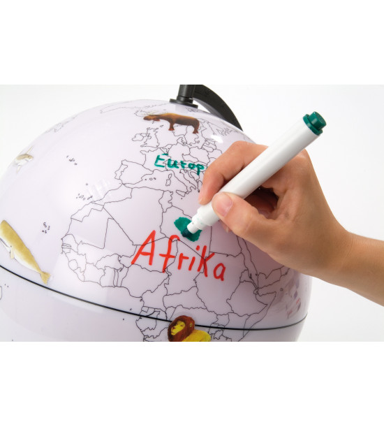 Popisovateľný glóbus má biely povrch s obrysovými linkami krajín bez názvov štátov. Popisujte štáty, kontinenty, oceány, moria stierateľnými fixami. Priemer glóbusu je 28cm. Súčasťou je 6 stierateľných fixiek a 12 nálepiek zvierat na oživenie učiva.Obsah: - glóbus, - 6 stierateľných fixiek, - 12 nálepiek zvierat.