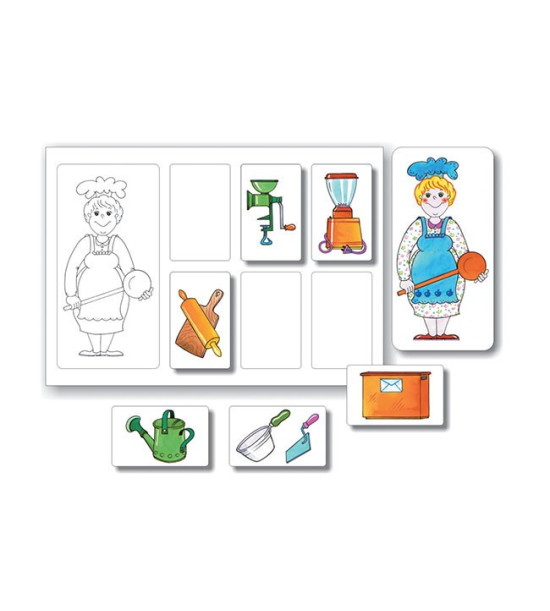 Veselo zobrazená pomôcka pomáha rozvíjať slovnú zásobu k téme profesie. Deti poznávajú profesie, jednotlivé druhy práce, náradie a nástroje, ktoré sa pri práci používajú. Profesie 1: záhradník, kuchárka, poštár, predavačka, stavbárObsah: 5ks ilustrované obrázky / 21 x 30cm / obojstranne laminovaný kartón 5ks magnetické ilustrované obrázky / 18 x 9cm / pevný kartón 2mm 30ks magnetické ilustrované obrázky / 8 x 5cm / pevný kartón 2mm Kartónová krabica.