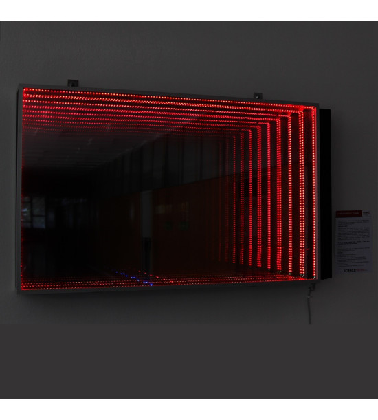 Priečelie do steny kotveného zariadenia tvorí efektná sústava zrkadiel umiestnených v drevenej konštrukcii tvaru obdĺžnika min. rozmerov 90x120 cm. Nekontaktný mikrofonický snímač pre hru je sotva viditeľným komponentom v ráme. Súčasťou vnútornej základne sú programovo riadené svetelné RGB LED pásy vyvolávajúce optický efekt viacnásobného odrazu v systéme paralelných zrkadiel. Nekonečným opakovaním sa odrazov v zrkadlách je vytváraný dojem pohľadu do hlbokého, po stranách ohraničeného priestoru. Hra, ako pridaná hodnota, je určená pre jedného hráča. Jeho úlohou je tlesknutím stopnúť modrý rotujúci bod tak, aby v relatívnom pohybe zastavil na pozícii červeného statického bodu a prekryl ho. V prípade akustického impulzu v správnom momente sa po splnení úlohy celá jedna strana obdĺžnika rozsvieti na červeno. Pokračuje sa tak aby sa rozsvietili všetky 4 strany obrazca.
