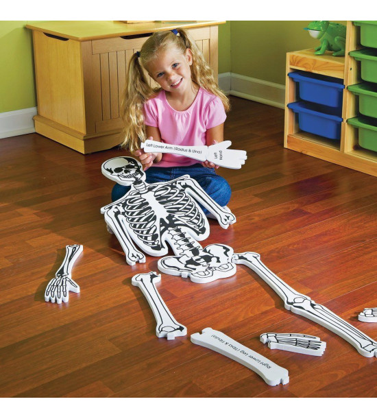 Deti sa pri zostavovaní tohto jedinečného puzzle z mäkkej peny, učia všetky hlavné kosti. Táto veľká 15-dielne puzzle skladačka je skvelé na hranie a zároveň učenie. Po zložení má kostra výšku 122 cm. S odvrátenej strany je popis jednotlkvých častí v anglickom jazyku.
