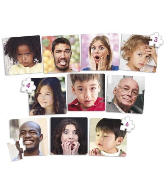 Sada 10 kartónových puzzle zobrazuje základné ľudské emócie, ktoré riadia naše správanie: radosť, sebavedomie, obdiv, zvedavosť, prekvapenie, hnev, znechutenie, smútok, strach a vina. Vďaka obrázku na zadnej strane ikony si deti môžu sami skontrolovať, či správne emóciu identifikovali. V sade sa nachádzajú: 4x puzzle s 3 dielikmi, 3 x puzzle so 4 dielikmi, 3 x puzzle so 6 dielikmi a 10 ikon zobrazujúcich emócie.