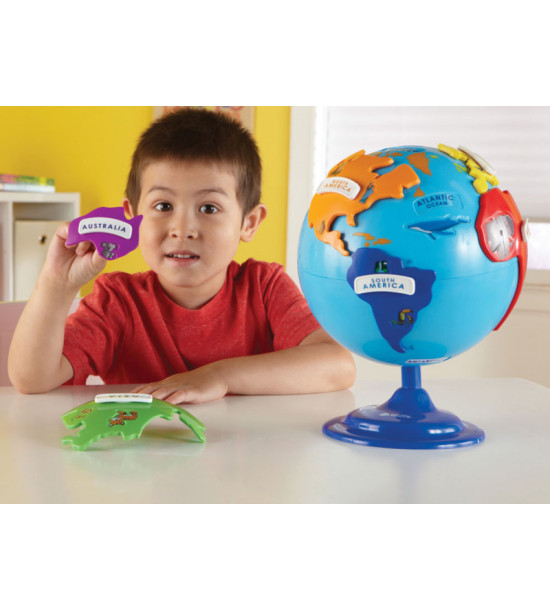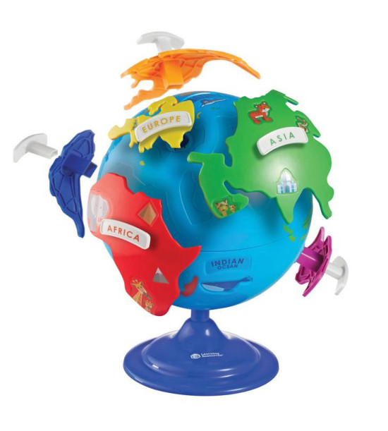 Farebný glóbus s vyberateľnými kontinentmi, je skvelou pomôckou pri základoch geografie. Na každom dieliku je vyobrazená typická historická pamiatka a zviera žijúce v danej oblasti. Priemer 20cm.