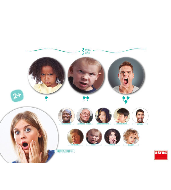 Objavenie a spoznanie emócií je prvým ktorom k vytváraniu emocionálneho podvedomia a dosiahnutia väčšieho sebaovládania . Hra učí rozpoznávať desať základných emócií, ktoré sprevádzajú a usmerňujú naše správanie pomocou výrazov a gestikulácie. Pomáha deťom zaradovať emócie medzi vhodné a nevhodné, príjemné a nepríjemné, správne ich používať a postupne ich radiť podľa vážnosti. Obsahuje 35 kartičiek o priemere 9 cm. Rozmery balenia: 23,6 x 18,7 x 7,2 cm. Vek 3+