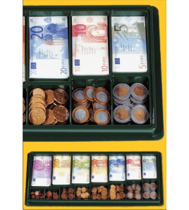 Demonštračná magnetická Euro-sada obsahuje 1 registračnú pokladnicu s triediacimi priehradkami a plastovým krytom, 40 ks bankoviek (5x 200 €, 10x 100 €, 5x 50 €, 5x 20 €, 10x 10 €, 5x 5 €) a 55 ks mincí (5x 2 €, 10x 1 €, 5x 0,50€, 5x 0,20€, 10x 0,10€t, 5x 0,05€, 5x 0,02€, 10x 0,01 €), znamienka matematických operácií ( +,-,=...). Na prednej strane je farebná potlač s reálnym vyobrazením eurobankoviek/mincí. Zadná strana je pokrytá magnetickou fóliu. Sada obsahuje nové bankovky 5€ a 10€. Vhodné pre magnetickú tabuľu. Rozmery bankoviek: dĺžka 15 - 24,4 cm, šírka 7,6 - 10,2 cm. Priemer mincí: 5 - 8 cm. Balené v kufríku s priehradkami.