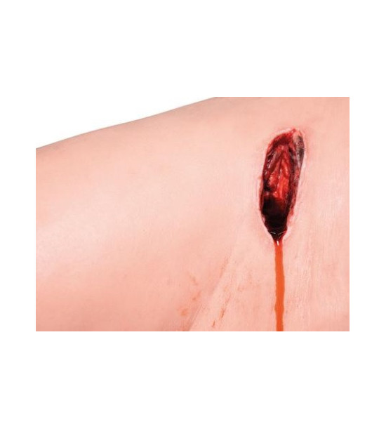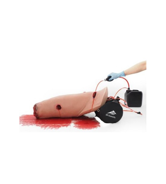 Cvičný model - simulátor stehna na kontrolu krvácania. Určené pre realistický tréning kontroly krvácania a manažmentu traumatických poranení na stehne. Študenti získajú istotu pri zvládaní ťažkého krvácania pomocou tlakových obväzov a ošetrenia rán a zručnosti pri ošetrení amputácií. Stehno je vybavené tromi rôznymi vzormi rany: Hlboká tržná rana (hĺbka 4 cm) v oblasti slabín; Priestrel veľkého kalibru so vstupnou a výstupnou ranou na stehne; Amputácia v oblasti kolena.Krvácanie každej rany je kontrolované inštruktorom, a to systémom manuálnej krvnej pumpy simulujúcej venózne (žilové) alebo arteriálne (tepnové) pulzujúce krvácanie jednotlivo alebo v kombinácii dve rany alebo tri rany spolu. Krvácanie je možné realisticky simulovať vrátane priamej spätnej väzby (zastavenie krvácania). Model nohy dospelého muža s amputáciou v oblasti kolena s realistickou vonkajšou anatómiou. Koža je vyrobená z vysoko kvalitného odolného silikónu SKINlike™, ktorý simuluje povrch ľudskej pokožky a tkanivo. Obsahuje orientačné body kostí a poškodené hmatateľné cievy. Priama spätná väzba: krvácanie sa zastaví (mechanická prekrytie ciev) po správnom priložení tlakového obväzu alebo škrtidla (umiestnenie a uzavretie) a aplikácia hemostatika XSTAT na model strelnej rany. Aplikácia tlakového obväzu môže byť najtesnejšie na proximálnom konci končatiny alebo 5-8 cm nad ranou. Pri správnom priložení turniketu (taktické zdravotnícke škrtidlo) sa krvácanie automaticky zastaví mechanickým uzavretím ciev. Je možné trénovať aj aplikáciu dvojitého turniketu. Každá rana môže byť skrytá pomocou špeciálneho krytu, ktorý ponúka rôzne scenáre zranenia. Hlboká tržná rana môže byť ručne ošetrená palpáciou na poranenej cieve. Junkčná a strelná rana môžu byť ošetrené gázou. Každá rana môže krvácať nezávisle. Tréning ošetrenia pahýľa nohy, resp. plochy veľkého rozsahu. Dropknee technika, junkčná rana je prekrytá (mobilita bedrového kĺbu, dotočenie nohy do plnej vnútornej rotácie).Navrhnuté pre použitie v teréne: robustná konštrukcia, nevyžaduje žiadne batérie ani externé napájanie. Jednoduché čistenie a preprava v taške (súčasťou balenia). Realistický simulátor pre opakovaný tréning. Systém krvácania: Bezpečný krvný zásobník (2 litre) so systémom manuálnej krvnej pumpy, simulujúcim venózne alebo arteriálne pulzné krvácanie. Bez spätného toku krvi do zásobníka počas ošetrovania rany. Obsahuje 250 ml umelej krvi na prípravu 2 litrov krvi. Rozmery a hmotnosť: 91 cm, 5,6 kg. Obsah dodávky: Model dolnej končatiny s 3 rôznymi traumatickými ranami. 2 kryty na rany. Systém manuálnej krvnej pumpy. Taška na prenášanie. Podložka dolnej končatiny. Zásobník na krv (2 litre). Koncentrál umelej krvi (250 ml). Tlakový obväz/škrtidlo nie je súčasťou dodávky!
