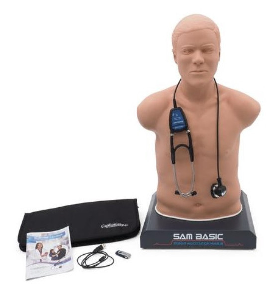 Auskultačná figurína dospelého SAM na vyšetrenie posluchom, ako základnej klinickej zručnosti potrebnej na posúdenie stavu srdca, pľúc, čriev a poranení. Jedna figurína umožňuje interakciu školiteľ - jeden študent alebo skupina študentov (súčasťou dodávky je 1 stetoskop, možnosť pripojiť až 5 stetoskopov). K dispozícii je 45 vysokokvalitných sprievodných zvukov (18 zvukov srdca, 20 zvukov pľúc (zahŕňa auskultačný pľúcny zvuk Covid-19), 6 zvukov čriev a 1 zvuk bolesti). Prenosná figurína s anatomicky presnými tvarmi simuluje torzo dospelého pacienta v životnej veľkosti a je dodávaná s auskultačným tréningovým stetoskopom Cardionics NursingScope, elektronickým simulačno-tréningovým stetoskopom vytvoreným na účely auskultačného tréningu alebo objektívnych štruktúrovaných klinických vyšetrení. Funguje bezdrôtovo s dodávaným ovládačom (notebook nie je súčasť dodávky) a poskytuje inštruktorovi prístup k veľkej vysokokvalitnej zvukovej knižnici. Inštruktor môže vybrať a zmeniť ktorýkoľvek z fyziologických a patologických zvukov, ktoré sa prehrávajú hneď, ako je hrudný stetoskop umiestnený na jednom z anatomicky správnych auskultačných miest figuríny. Cez aplikáciu SimScope je možné pripojiť a ovládať až 5 stetoskopov. Obsah dodávky: 1x Prenosné mužské auskultačné torzo SAM Basic. 1x SimScope® auskultačný tréningový stetoskop. Softvér SimScope® dodávaný na flash disku. USB kábel. Návod na použitie.