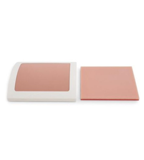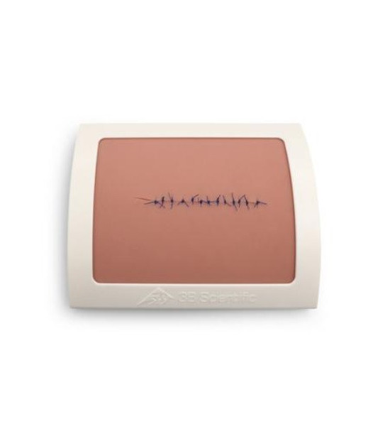 Cvičný model kože na nácvik šitia. Model cvičnej kože 3B na nácvik šitia dokonale demonštruje anatomickú štruktúru vrstiev ľudskej kože vrátane vrchnej časti pokožky, väzivového tkaniva a spodne vrstvy pokožky (epidermis, dermis a hypodermis), aby vytvoril realistický pohmatový/haptický zážitok z tréningu. Použitím podložky na umiestnenie modelu môžete využívať napätie kože pre realistickejší zážitok zo šitia. Toto napätie kože simuluje smer orientácie podkladových kolagénových vlákien. Ostrým skalpelom je možné vyrezať rany tak, aby zodpovedali požadovanej hĺbke a umiestneniu na podložke. Šijacie materiály a sponkový materiál možno z rezov odstrániť, čo umožňuje opakované použitie trenažéra. Materiál je veľmi robustný, vysoko kvalitný, určený na dlhodobé používanie.Nácvik rôznych techník zošívania kože vrátane: Jednotlivý prerušovaný steh; pokračovací steh; zošívanie kože svorkami; Z steh; intradermálny vnútrokožný steh.Obsah dodávky: 2x vankúšiky/modely kože, 1 x podložka na šitie kože. Hmotnosť 0,455 kg. Rozmery 24 x 15 x 4,5 cm. Pre skupinové aktivity odporúčame doobjednať balenie 10 náhradných vankúšikov/modelov kože 1024496.
