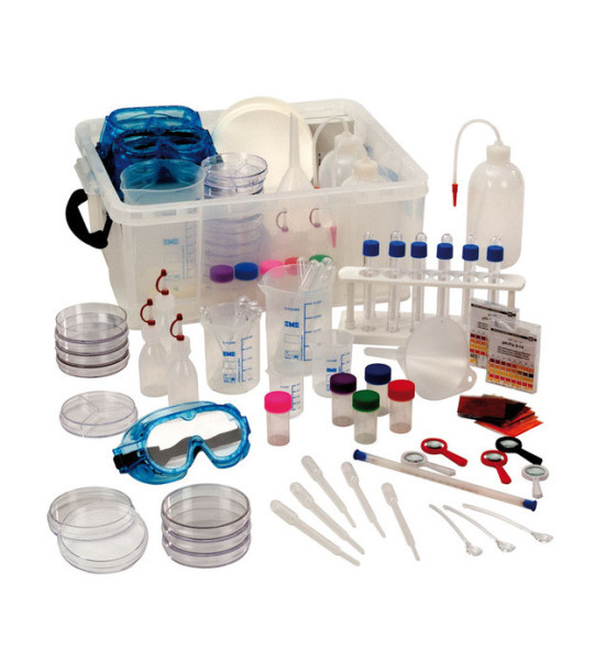 Sada obsahuje: 10ks okuliarov, 12ks skúmaviek s viečkami, 1ks stojan na skúmavky, 2ks vodný filter, 20ks Petriho misky jednoduché, 1ks teplomer, 5ks kvapkadlo, 3ks fľaše s rozprašovačom, 100ks indikátorové prúžky, 12ks pipety, 10ks lyžička na miešanie, 3ks prášková farba pre farebné experimenty, 10ks zberných nádobiek, 5ks odmerky, 3x zväčšovacie sklá s 5x zväčšením, 2 lupy so zväčšením 10x, 1 úložný box.