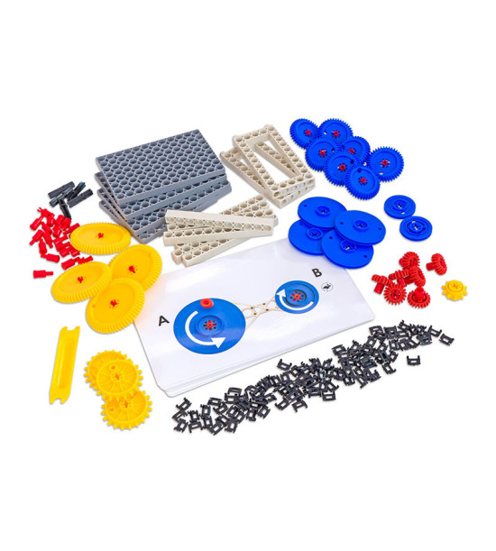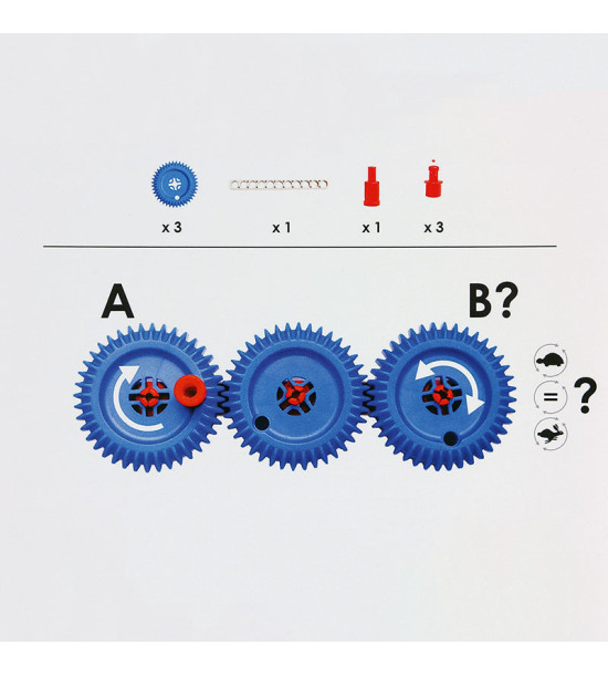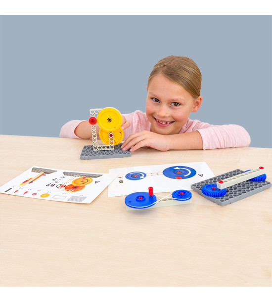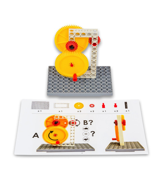 Objavte princíp prenášania pohybu vďaka ozubeným kolesám. Naučte žiakov nastaviť konfiguráciu podľa schémy na inštruktážnej karte. Zistite, ako sa tvorí ozubené súkolie. Vykonávajte rôzne pokusy s použitím rôznych typov a veľkostí ozubených kolies. Pozorujte rozdiely v smere a rýchlosti.Balenie: 4ks základná doska 124 stavebných dielikov 10ks pracovné karty 1ks box