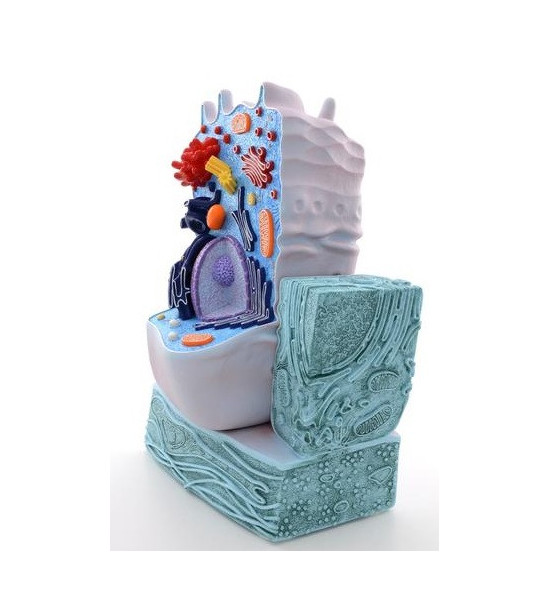 Dvojdielny model živočíšnej bunky ukazuje formu a štruktúru typickej živočíšnej bunky, ako ju možno vidieť pomocou elektrónového mikroskopu. Všetky dôležité organely sú znázornené vo zvýšenom reliéfe a vo farbách: jadro, mitochondrie, endoplazmatické retikulum, bazálna membrána, kolagénové vlákna, Golgiho aparát, mikrovillus, lyzozóm. Zväčšenie cca 10000-násobné. Rozmery: 21x11x31 cm, hmotnosť 800 g.